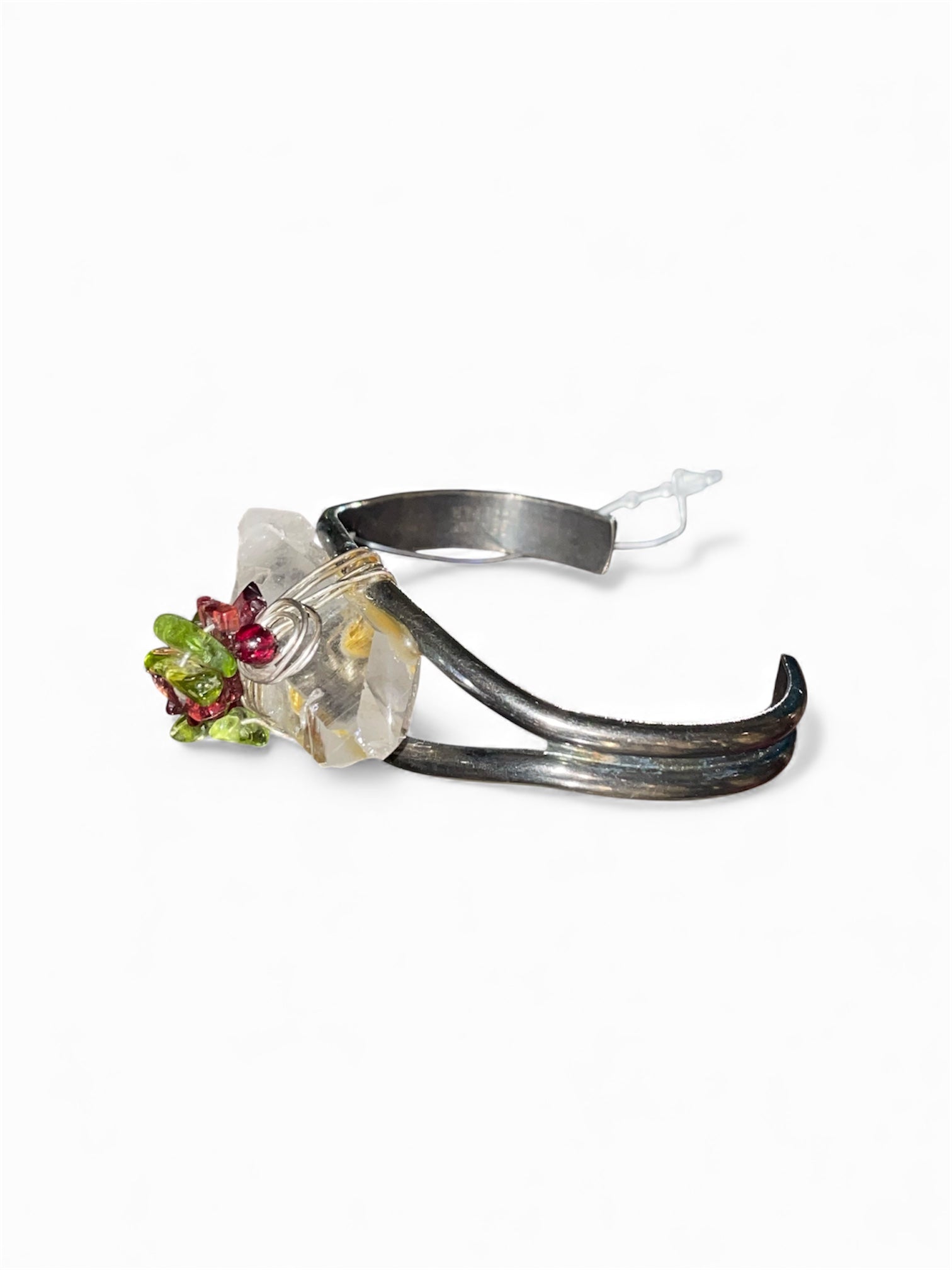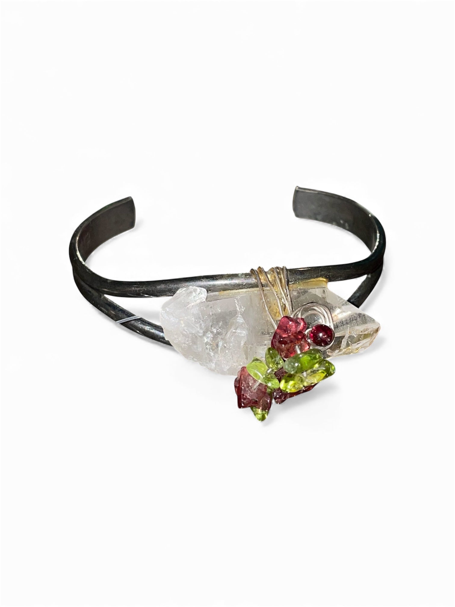 Large crystal is the focus of this beautiful copper and stone bracelet! Marked genuine copper on inside of bracelet. Green and purple stones are wire wrapped on top and around large crystal to give a pretty pop of color. Opening measures 2.5 inches and can have a little give in either direction to adjust.